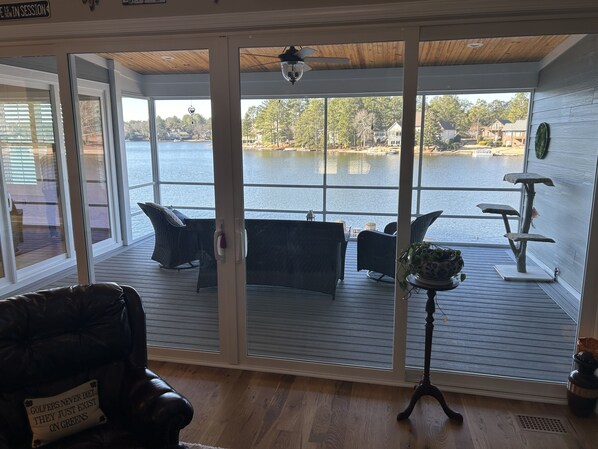 This brand new house has 4 bedrooms - each with its own full bathroom, ceiling fan and brand new Smart TV. This spacious and immaculate home is laid out on two levels providing all the amenities of home. The main floor has hardwoodd throughout! The master bedroom located on the main floor, with amazing views of the lake, has a king size bed, a walk-in closet and a master bathroom with a double vanity, Kohler clawfoot tub, walk-in-shower and a private commode. The other two bedrooms on the main floor have queen beds, Smart TV's and ensuite private attached bathroom. The second master bedroom on the lower level has a king size bed, Smart TV and ensuite private attached bathroom. All bedding in the house is new as of August 2023. The main floor living room offers a brand new 75" Smart TV and gas fireplace. The lower level of the home also includes a rec room that includes a beautiful 8 foot slate pool table. Spectacular views of the lake off the upper level of the screened-in porch are the highlight of this beautiful home along with the lower level covered patio that is an inviting place to grill and dine on the eight (8) seat patio table. Between the firepit area and dock, there are eight (8) adirondack chairs available to sit and enjoy your morning coffee or a refreshing cocktail while providing a beautiful and peaceful view of the lake. The home also has a multipurpose room located off the living area that includes a large island that is used as an office area and includes a brand new washer and dryer set. There are six (6) Smart TV's in the house along with FREE wifi among the amenities offered.
