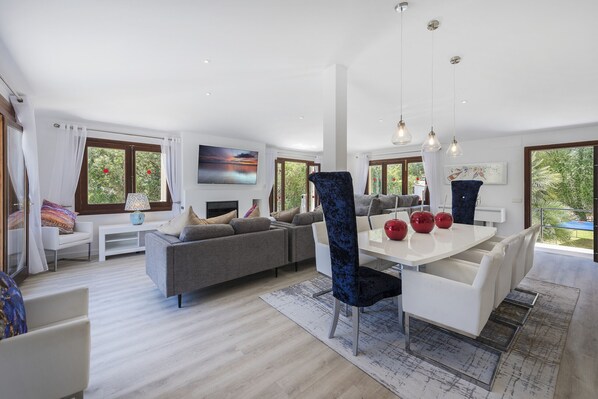 As you enter the villa to a spacious round entrance hall which leads you into the large lounge/dining room. Once in the lounge there is ample seating while relaxing watching the smart tv. The large dining table seats the whole family or friends for those get together meals. The open plan kitchen and lounge area gives a fabulous circulation space for the whole group. The kitchen is contemporary in design and has everything you need for you stay, from the induction hob, microwave, kettle, coffee machine to the usual kitchen utensils. The villa also has a separate utility room with washing machine and drying machine, ironing board, highchairs and cots for your use.