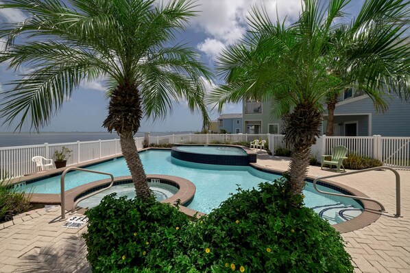 The Las Joyas community offers wonderful family-friendly amenities available for your use while you stay with us. These include sparkling community pool steps from the front door, hot tub, and well equipped lounging area. Basketball hoop, children's playscape, and picnic benches overlooking the bay are also available for your enjoyment. ( swimming pool is NOT heated ) ( Hot Tub heated 24/7 year round ) .