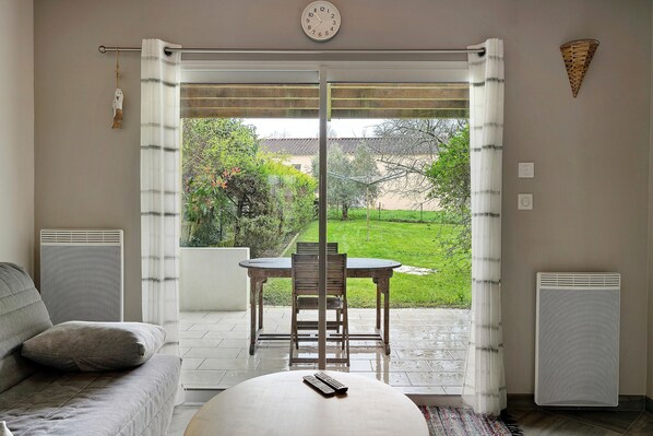 Step outside to enjoy your private uncovered terrace with pergola shade and relax in the shared garden featuring hammocks and sun loungers. The property offers a peaceful setting surrounded by greenery near the Acheneau river.