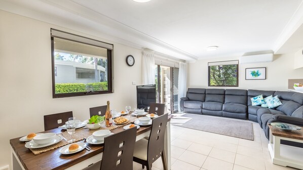 The open plan, tiled dining and living area have been thoughtfully furnished with a comfortable leather loungeroom suit with built in recliners so you can sit back, relax and watch TV on the large flatscreen with the bonus of having Foxtel Standard package and a fantastic view straight out to the outdoor courtyard garden BBQ area and pool.
