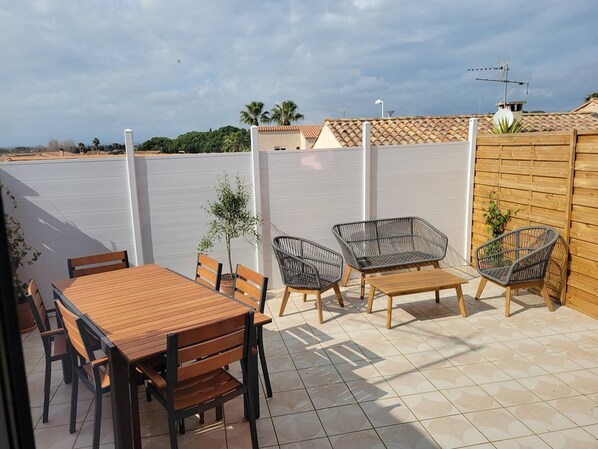 Outdoor dining - Villa with 2 bedrooms, Airconditonning, Wifi, nice terrace,near canal du midi in the village of... (PORTIRAGNES)