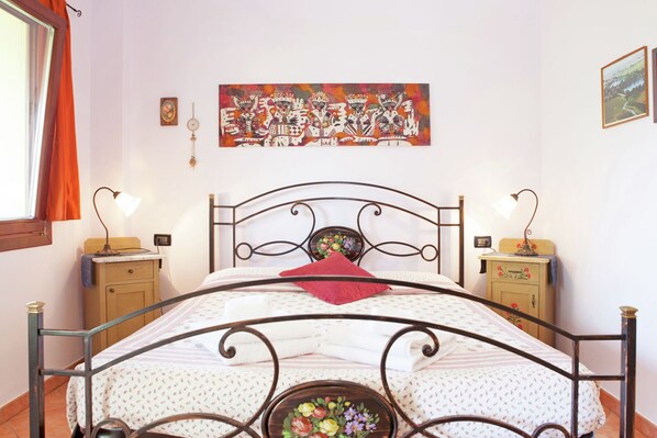 Layout: On the 1st floor: (Living room(double sofa bed, TV), open kitchen, bedroom(double bed), bathroom(shower, washbasin, toilet, bidet)) terrace, garden(shared with other guests), garden furniture, parking, pond