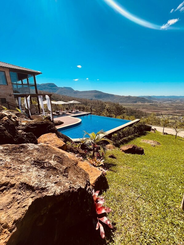 Mountain views provide a peaceful backdrop for travelers seeking relaxation at this retreat with a refreshing pool and scenic surroundings.