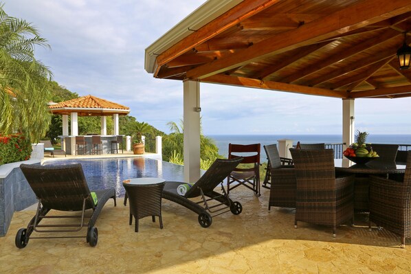 • Patio doors open to reveal the pool terrace and breathtaking ocean vistas.