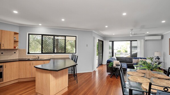Beautifully presented, air-conditioned family beach getaway, only minutes from the beach and main street. Perfect for a family or friends getaway. You can walk down the street and grab an icecream or a coffee, or head down the beach and throw a line in or have a swim. No need for the car, you can walk to everything from here with ease.