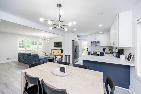 In North Raleigh, this newly renovated home offers a comfortable retreat for families and friends alike. With a fully equipped state-of-the-art kitchen, enjoy cooking meals together or cozy up in the living room with throw blankets and your favorite shows on smart TV.