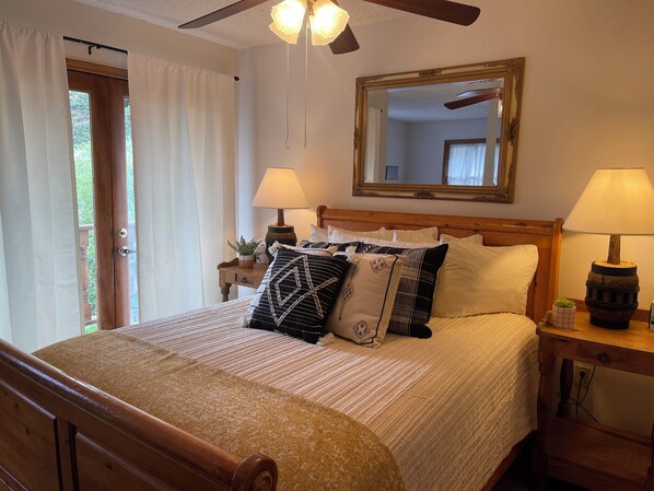 The cozy living room has a large flat-screen Tv and a wood-burning fireplace that you will enjoy from the adjoining dining area as well. The fully-equipped kitchen is available for all of those home-away-from-home cooked meals that just seem to taste better when on vacation (or you can catch the complimentary town trolley to one of our local eateries).