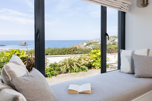 A spacious, open-plan living room with floor-to-ceiling windows framing sweeping views across Portreath and the Atlantic. Comfortable sofas, a feature fireplace and sliding doors to the terrace make it the perfect space for both cosy evenings and sunlit gatherings.
