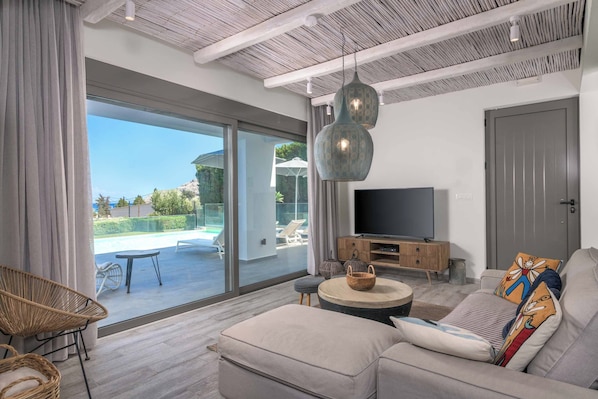 Villa Krini Myth, where sleek interiors and sea views blend together seamlessly. Relax by the chic infinity pool or unwind in the open-plan lounge with a flat-screen TV, while enjoying modern appliances in the adjacent kitchen.