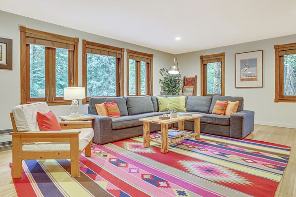 Tucked into a forested community along the Sandy River, this European-inspired chalet offers an idyllic retreat. Unwind in the skylight-covered hot tub or roast s’mores around the propane gas firepit as sunset approaches. The cabin features a fully fenced backyard with outdoor seating and a grill for al fresco dining, while inside you'll find cozy seating areas and plenty of natural light.