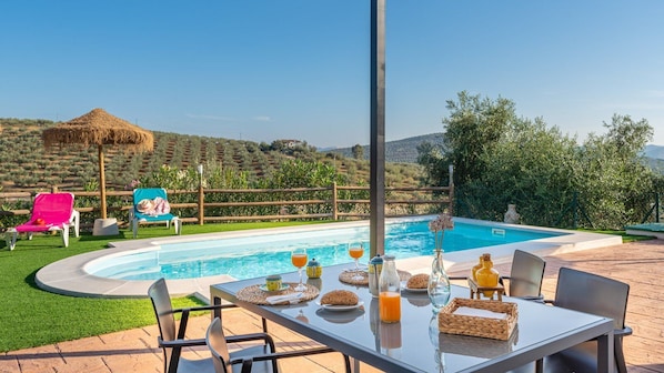 Outside we find a porch with tables and chairs on one side and on the other with a large built-in barbecue area. It has a ping pong table. On the terrace we find an area with grass and the pool with views of the mountains.