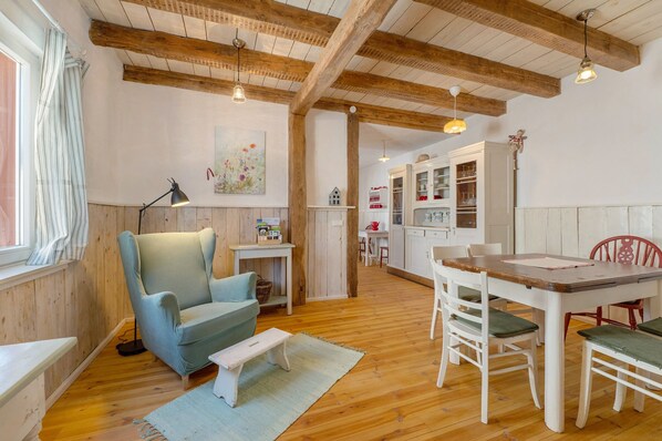 You live alone in the green cottage. With its 2 bedrooms, it offers space for 4 guests. The loft (not suitable for standing) offers additional sleeping space. Each of the two bedrooms has its own small shower room. There is a separate guest WC on the ground floor. In the well-equipped kitchen with dishwasher, stove with hob, microwave, fridge, toaster, kettle, filter coffee and Senseo machine. There is plenty of crockery, drinking glasses, wine and champagne glasses, cutlery, etc. at your disposal. The open kitchen leads into a cozy dining room, further into the living room with TV, wood stove for the cool evenings and direct, flat access to the terrace and the small garden. There is Wi-Fi in the house and a washing machine and tumble dryer in the cellar. Smoking in the house and pets are not allowed. There is a parking space on the property. Our vacation home is not available for stag parties, graduation parties and parties.