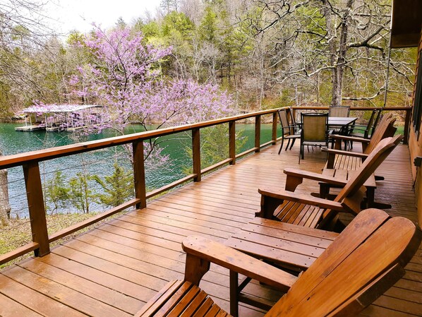 This cabin has easy access lake frontage on TWO sides! You can actually walk right out the lower-level doors to the two-tiered spacious deck, and down the deck steps and be right in the water. Enjoy swimming, fishing or simply relaxing on the water!
