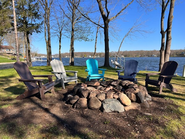 The ¼ acre, oval-shaped island has an open grassy area with a picnic table and outdoor games including lawn darts, corn hole, and bocce ball for your enjoyment; and it also has a shaded area with a rock fire pit nestled among the trees.