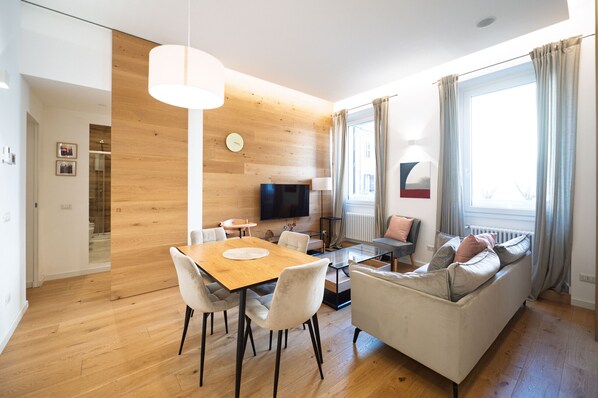 The spacious and welcoming living room is furnished with an elegant sofa that invites you to relax, while a wall-mounted TV offers moments of entertainment. The large windows with light curtains allow natural light to enhance every detail, creating a warm and harmonious atmosphere. The adjacent dining area is perfect for conviviality and gatherings with friends and family.