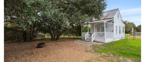 The Wild Blue Yonder Room at Wander Inn offers a rustic retreat with vintage charm. Enjoy a private balcony with rocking chairs for sunset views, a common area with a gas fireplace, and explore the 65-acre property with free bicycles. WiFi, a mini-fridge, and a Keurig add comfort.