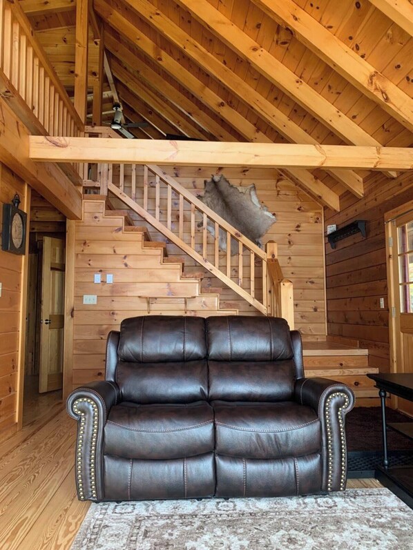 The solid wood architecture, animal skin tapestries, and rustic interior design elements illicit the feeling of being in a woodsy outdoorsman’s cabin, yet with all the modern conveniences that today’s guest seeks, like speedy WiFi, streaming TVs, electric baseboard heat, remote-controlled ceiling fans and portable AC units.