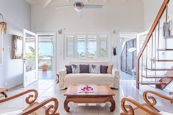 La Plantation "Le logement dispose d'une terrasse magnifique avec une vue mer et palmiers mémorable. La cuisine est bien équipée, il nous a manqué toutefois une cafetière avec filtre. Le Ti-punch à l'arrivée était une attention très appréciable. Petit bémol pour la chambre à coucher qui est sous les toits, il faut vraiment faire attention à ne pas se cogner la tête."