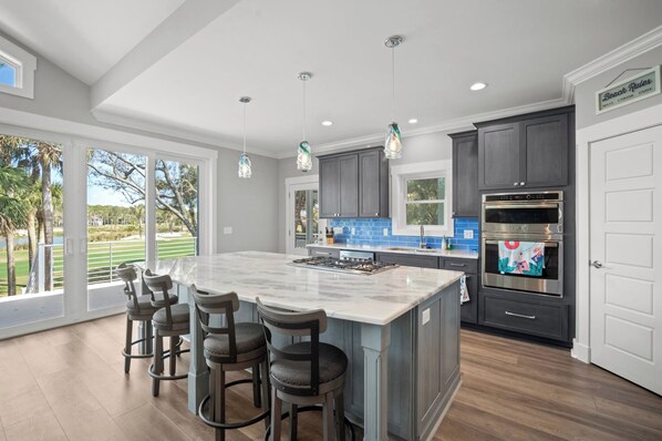 The well-appointed gourmet kitchen offers everything you need to prepare quick snacks and special occasion meals including 5-burner gas range built into the island with pop-up lighted Cattura downdraft, and double wall oven with optional microwave.   Use the kitchen's Le Crouset cookware to cook on the all brand new stainless steel appliances.  The owner is a gourmet chef and has gone to great lengths to provide you with a top notch cooking experience! You’ll find a drip coffee maker, keurig, toaster, blender, food processor, pantry and more.  It’s truly home away from home.  A large screened in porch can be accessed from the kitchen or the rear patio, and has relaxing furniture and a television.  The wet bar area with its own ice maker and beverage refrigerator is a great way to wind down your evening while crafting cocktails.  Use the ice maker to fill your cooler for a sunny day at the beach! The beautiful solid wood dining table is large enough to seat 12 and there are plenty of extra dining table chairs in the bedrooms throughout the home to accommodate. After dinner, sit around the gas firepit on the expansive rear porch while watching the night time stars. Or enjoy morning coffee on any of the other 3 porches.