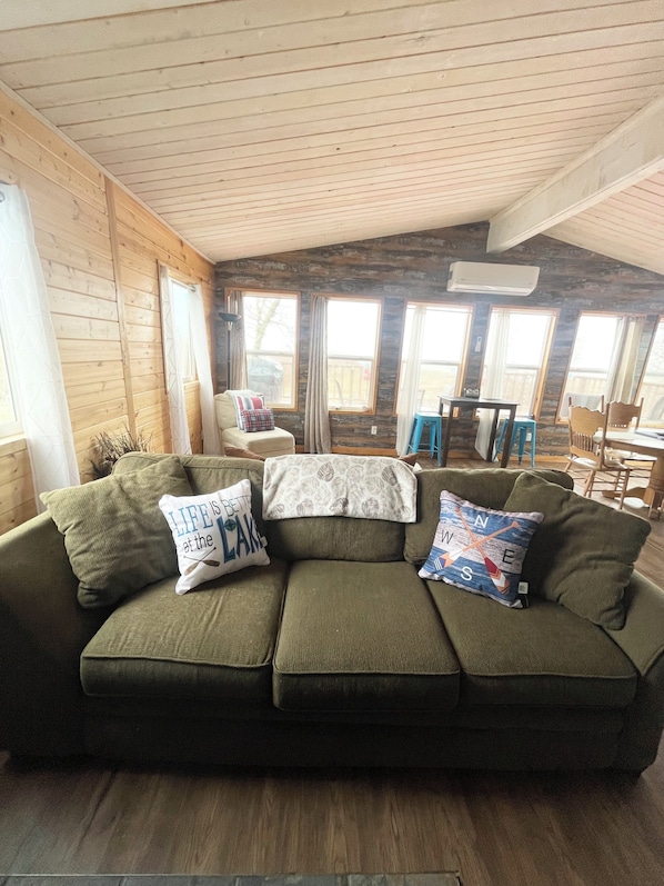 This 3-bedroom retreat offers an open concept kitchen, living room, and dining area. Unwind on the spacious deck with a BBQ or enjoy quality time in the green space between the cabin and sand beach.