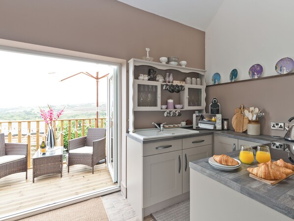 Bedroom: Galleried, Double (4ft 6in) Bed Ensuite: Roll Top Bath, Cubicle Shower, Heated Towel Rail, Toilet. Electric radiators, electricity, bed linen, towels and superfast Wi-Fi included. Welcome pack. Use of owner’s washing machine and tumble dryer.. Balcony. Lawned garden with decked area, summerhouse and chiminea (shared with owner). Dog sitting available on request. Bike store. Private parking for 3 cars. No smoking. Please note: . There are steps and drops in the garden. Property accessed by a ½ mile rough track. Sorry, no children.. Set into a hillside, this 1700s, stone cottage retains its original character and charm, along with a blend of modern and contemporary. Renovated to a high standard in 2018, and accessed by a ½-mile rough track, this delightful home from home offers a warm welcome with complimentary wine and cake on arrival, and boasts an open plan living space featuring a cosy living area, and a well-equipped, compact kitchen. Patio doors lead onto the balcony boasting open views over the surrounding countryside and out towards Staithes and the sea. It makes the perfect spot to enjoy a morning cup of coffee. Venture upstairs and cosy up in the double bedroom complete with an en-suite bathroom with roll-top bath, separate power shower and complimentary bath robes, slippers and toiletries. In the summer months, spend your days lazing on the decked terrace or in the winter months, light the chiminea and warm your toes whilst you enjoy spending time with your loved one. With the owner and her friendly dogs living next door, you can also enjoy shared use of a lawned garden with a beautiful summerhouse, perfect for whiling away the hours with a good book. You’ll be sure to feel right at home in this magnificent cottage.