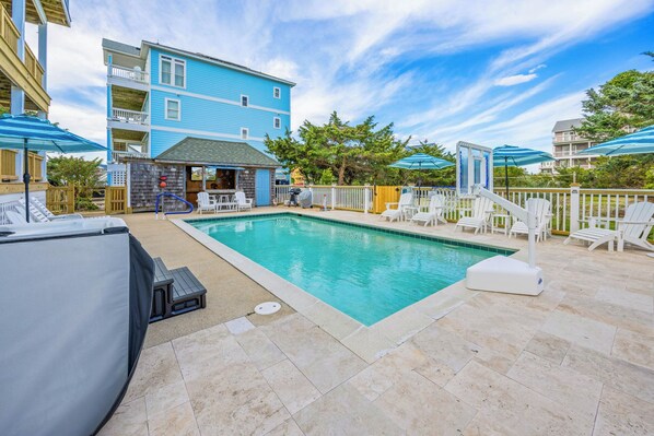 Pack your paddle boards, kayaks and wind sports equipment ... the Wind Over Waves community’s 100-foot pier and boat ramp are ideal for pursuing your active endeavors. And don’t forget your pickleball equipment ... the expansive driveway includes a private court! Settle into a more tranquil flow alongside the private pool, where a seven-person hot tub eases tired muscles, an outdoor shower accommodates a convenient rinse off, and a tiki bar with a sink and refrigerator quenches your thirst. Grab a stool, pop open a cold one, and let the Smart TV provide all the action you need; that is, until the competitive spirit compels you into the first level game room featuring a pool table, Smart TV, and wet bar with refrigerator. When you’re ready to reset for the next day, you’ll discover how easy it is to drift off to sleep in the home’s seven master bedrooms — including three kings, two queens, a room with two singles, and another with two pyramid bunks — each with its own private bath and Smart TV.