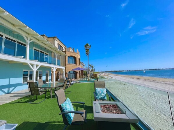 The custom 1,000 sq ft beachfront yard and patio is an impressive entertaining space and has direct beach access! The views of the sand, boardwalk, and Sail Bay from the patio are amazing. Enjoy dinner or games on the big patio table or just relax on the lounge chairs to soak up some sun. We also have a propane fire pit so you can carry on outside even after the sun goes down. It is spacious with vaulted ceilings and large bay view windows. The kitchen is fully stocked for meal preparation, dining and entertaining. The dining room opens up onto the balcony, making sunset dinners a real treat! The upper level has a 40ft balcony, living room, 2 of the bedrooms, the kitchen and dining area!