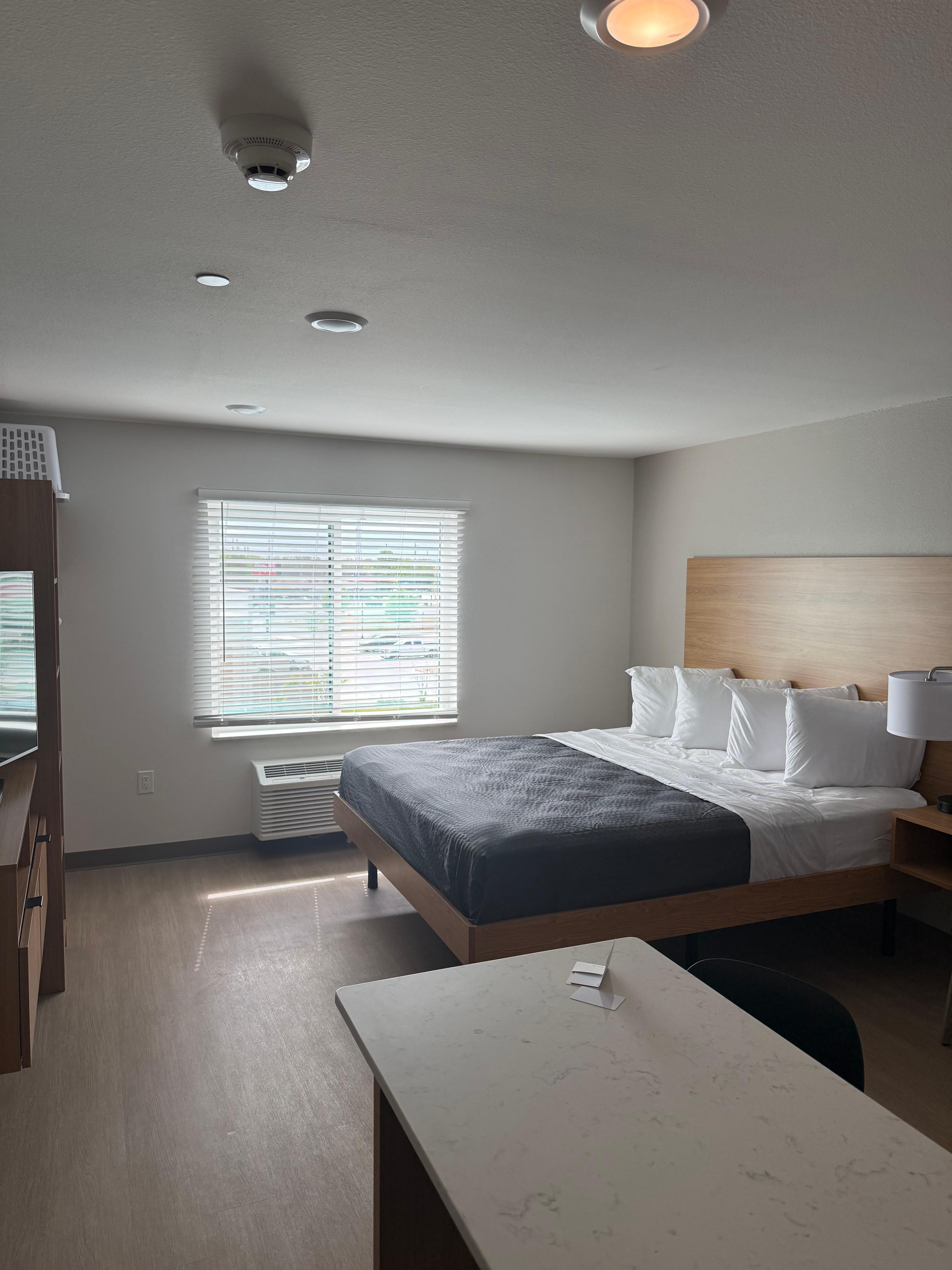 This is a new facility and truly is extended stay because there are no amenities like a hotel so do not expect that. The room floor, tub, and toilet was dirty and had to have them clean again. The bed sheets are thin as papers if you stay here being your own own and sheets.