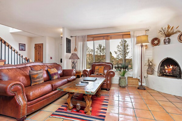 Escape to a charming getaway with breathtaking views of Santa Fe's historic downtown. Unwind by the kiva fireplace or enjoy morning coffee on your private patio.