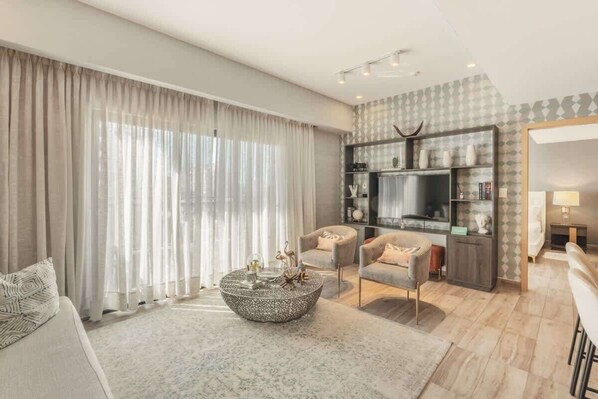 Modern Room with exclusive furniture, elegantly decorated. Smart flat-screen Tv Aire acondicionado Walk-in Closet Bathroom en suite Lingerie and amenities Hermosa sala de estar con muebles modernos, televisor inteligente de pantalla plana, aire acondicionado y sofá cama. Baño de invitados Dining area and breakfast area Fully equipped kitchen with stainless steel appliances, glassware, cutlery, utensils and articles for food preparation and service. Balcony Caja de seguridad Laundry area with Washer - Dryer and Iron Digital contact locks Wifi Facilities / Social Areas: