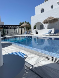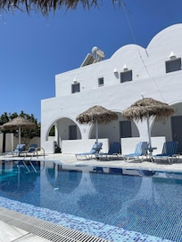 Located near Perissa Beach, Villa Valvis offers in-room WiFi and an outdoor pool complex with a separate children's pool. Sun loungers provide relaxation spots, while on-site car rentals and luggage storage make family vacations hassle-free.