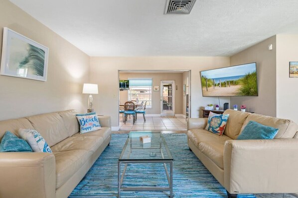 Feel right at home in our cozy retreat! After a day of exploring the stunning white sands of Siesta Key or Lido Key and enjoying Sarasota’s many attractions, unwind in your large screened-in patio with a refreshing cocktail. Lounge on the expansive, well-manicured lawn, grill up some burgers in the outdoor grilling area, or enjoy board games in the sunny game room.