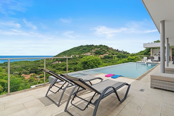 Step into the heart of this coastal retreat, where an open floor plan seamlessly blends the living spaces. With a fully equipped kitchen, expansive private terrace, and private infinity pool and hot tub, you'll find relaxation comes easy in this luxurious haven. The two-floor layout provides ample space for both togetherness and solitude.