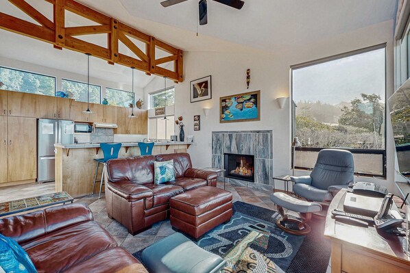 All guest rooms at Ocean-view Sea Ranch home with hot tub near Walk On Beach boast comforts, such as fireplaces and air conditioning, in addition to amenities, such as offices and dining tables.