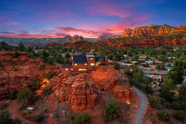 Step outside and immerse yourself in the unparalleled beauty of Sedona`s landscape. Multiple meticulously outfitted spaces await, inviting you to soak in the breathtaking views and create unforgettable memories with your group. The wrap around flagstone patio features a private 8-person jetted hot tub where you can unwind and rejuvenate amidst the vast red rock beauty. Fire up the propane grill and enjoy the best sunset view in town. Gather your group around the wood-burning chiminea, or relish a delightful meal together at the outdoor dining table. This outdoor haven sets the stage for an unforgettable Sedona experience.