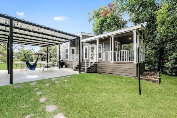- Extensive outdoor space with propane grill, hammock, swinging chair, covered open-air dining / lounge area with big screen TV, fire pit, s'mores sticks, outdoor shower and half bath