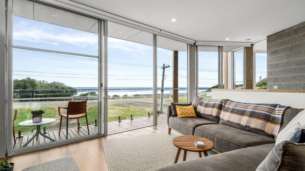 Relax on the comfy couch in the upstairs living area, by the wood fireplace looking out to sea, or watching something on the Smart TV. The main bedroom is also upstairs, featuring views to the ocean from the king size bed, with ensuite bathroom.