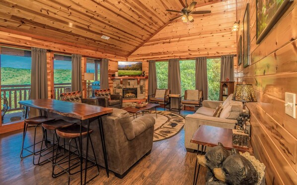 After exploring waterfalls, shops, and shows, return to unwind in this cozy living space. Floor-to-ceiling windows frame stunning mountain views and flood the room with natural light. Open to the dining and kitchen areas, it's perfect for group gatherings.