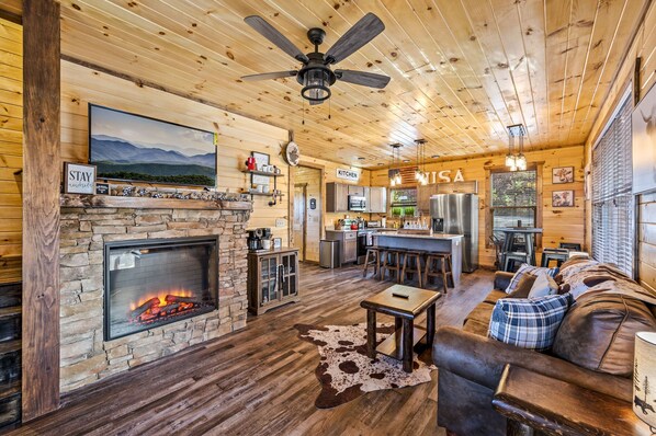 Escape to the Smoky Mountains at Old Glory's View, a brand new cabin with spectacular mountain views and all the comforts of home. Unwind in the Jacuzzi or gather around the Fire Pit for s'mores and stories, while kids enjoy Air Hockey and Giant Jenga in the Game/Movie Room.