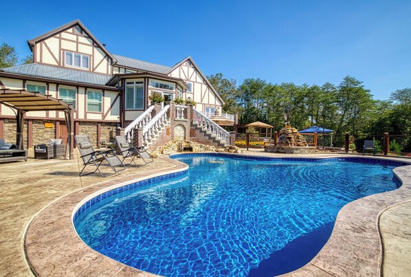Welcome to Tudor Rose, your exquisite retreat in the heart of Pigeon Forge, just 4 miles away from the enchanting Dollywood Theme Park. As you pass through the private gate and onto the 5.5-acre estate, you'll be transported to a world of luxury and tranquility like no other in the Smoky Mountains area.