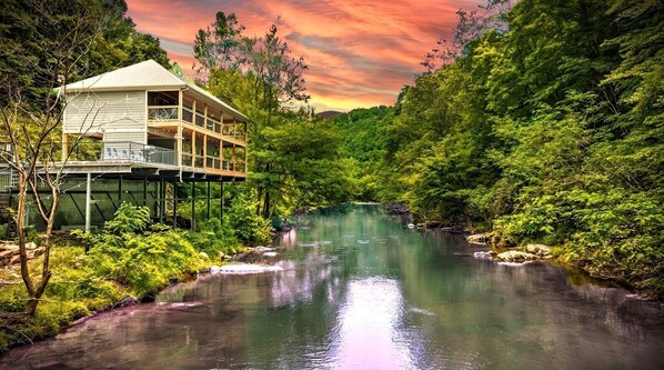 Evenings at the "Blissful River Stream Hideaway" are a symphony of stars and river sounds. Cozy up by the fireplace in the living room or enjoy what nature has to offer while soaking in the private hot tub with the sounds of the river in the background.