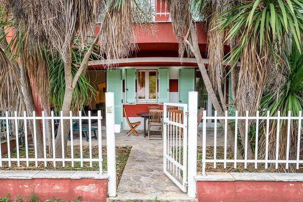 Description: living room with kitchenette (with dishwasher), dining table and double sofa bed - master bedroom with double bed - bedroom with two single beds (one pull-out) - bathroom with shower and washing machine - delightful garden with porch, table and chairs - private and reserved parking space. Air conditioning in the living room.