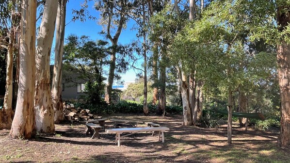 Enjoy the cosy wood fire in the lounge room which opens onto the deck with filtered views to the ocean. You will find polished floorboards, separate kitchen area and 3 bedrooms accommodating a total of 7 guests. Sit amongst the gum trees in the native garden and paved outdoor setting. Just a few minutes’ walk to Skenes Creek Beach and if you’re lucky you may even see a resident Koala!