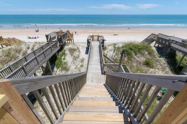 Escape to Sol Therapy, where a 4-bedroom haven awaits with private beach access just steps from your porch. Enjoy ocean views from the third-story living space and unwind on one of the dog- and kid-friendly porches with gates for added security.
