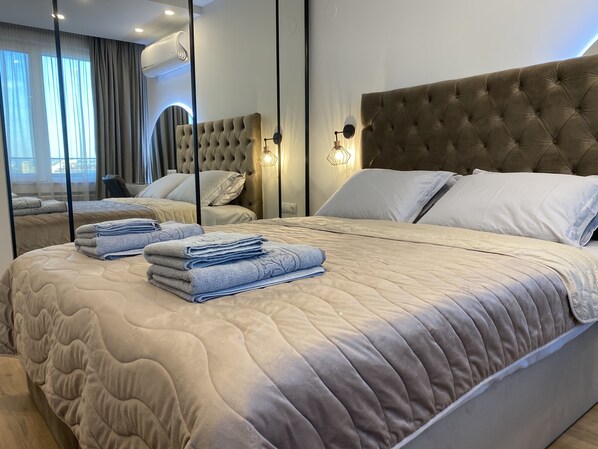 The apartment consists of a very spacious, bright and stylishly designed living room with big and comfortable sofa (which stretches and turns into a large bed if needed), each place could also be used as a couch for extra comfort, flat screen TV with international channels, designated dining area and fully equipped kitchen with all needed facilities. It leads to a balcony with a great view.