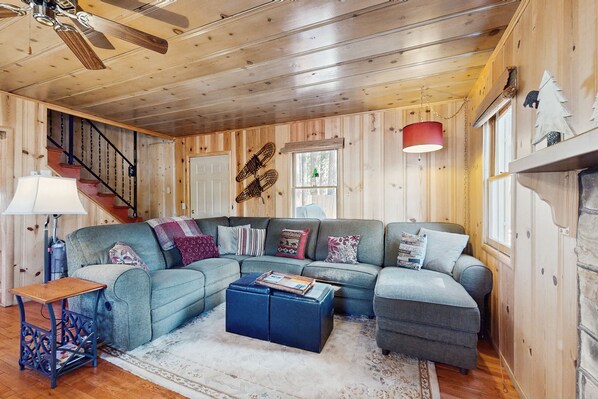 Lovely cabin with a great common area and tons of beds.
