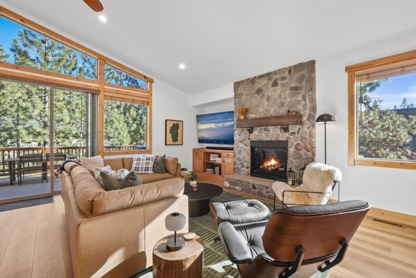 🔥 A Living Room Made for Chill Kick back by the gas fireplace, stream your favorite shows on our large smart TV or melt into our leather Living Spaces sectional after a day of exploring. Our big windows let in that Tahoe sunshine (or snow-globe magic, depending on the season).