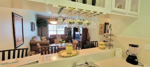 Our entire condo was repainted Jan 1 of 2023 so it is a fresh, newer and clean feel inside. The kitchen has open concept with a nice counter top / bar that you can easily serve a family meals off of. The kitchen is fully equipped with pots/pans/dishes/utencils/a blender and coffee maker so ready for you