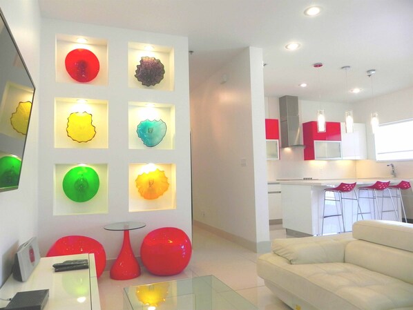 Step inside to find a luxurious remodeled living space with lots of lights. After a long day in the sun, you can relax with a book on the leather sofa, watch the large flatscreen TV, or head outside to the pool area to sip a refreshing cocktail.